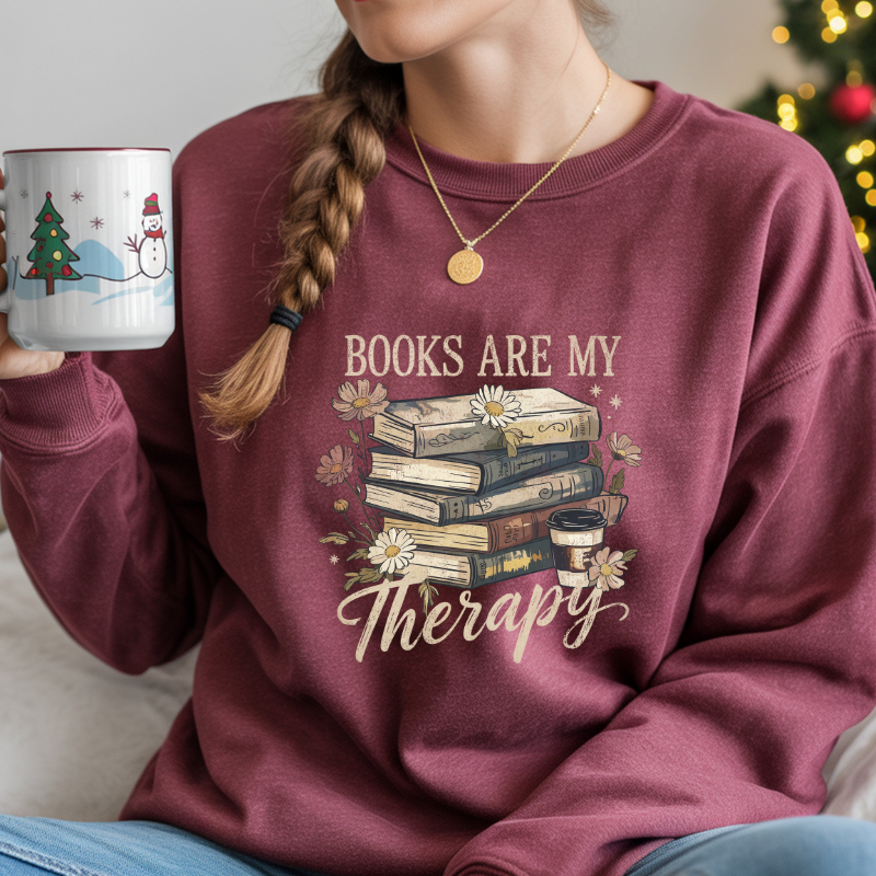 Cozy up in pure comfort with this charming “Books Are My Therapy” sweatshirt — perfect for every book lover who finds peace between the pages. Featuring a beautifully illustrated stack of vintage books, soft florals, and a warm coffee cup, this design brings all the aesthetic, calm, and cozy vibes you crave.