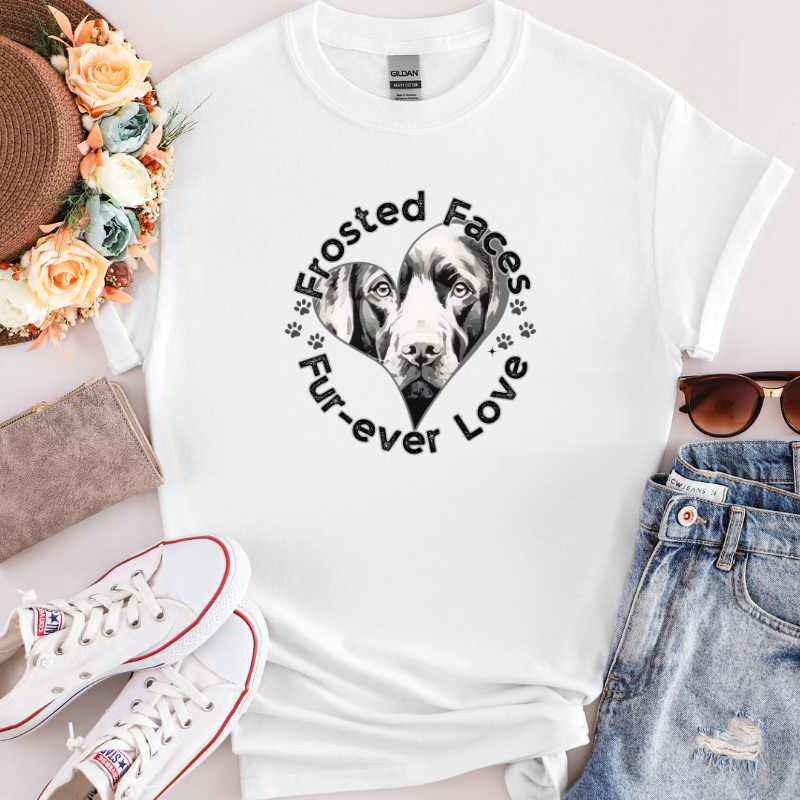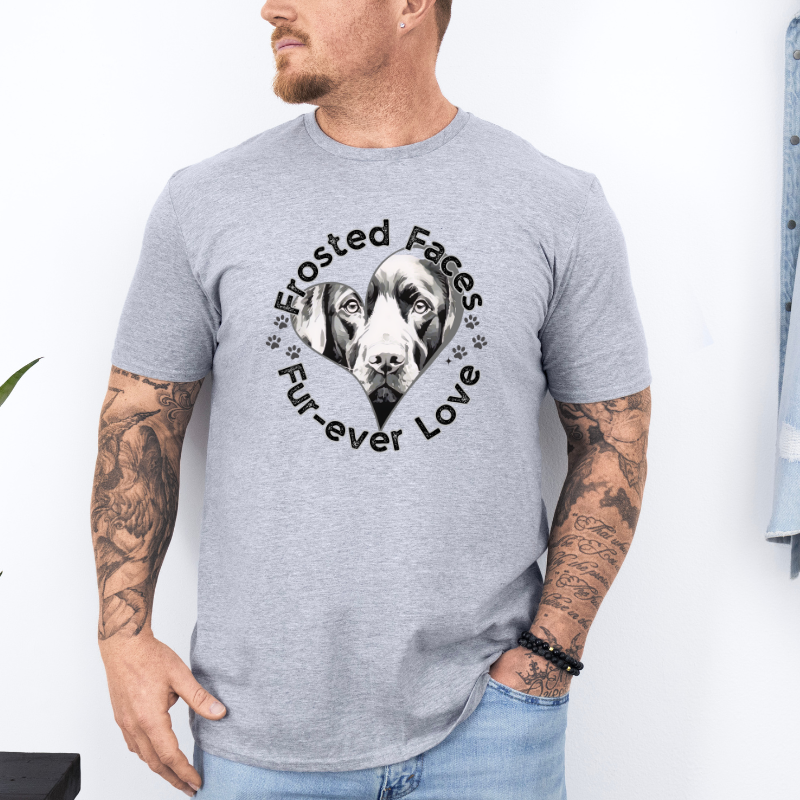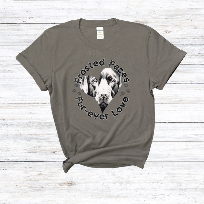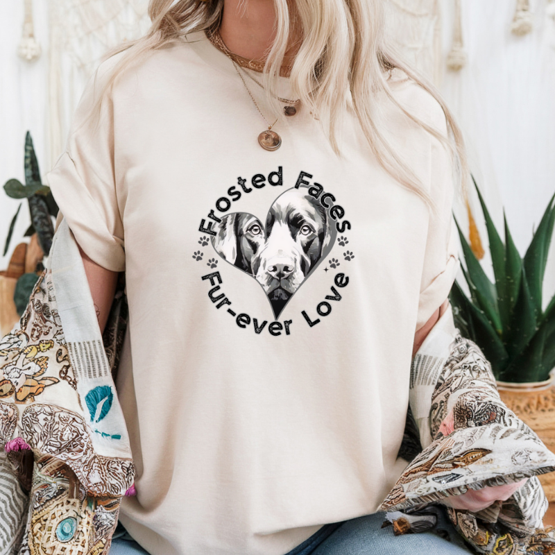 Celebrate the timeless bond between you and your senior pup with our Frosted Faces Fur-Ever Love T-shirt. Featuring a black and white dog face inside a heart outline, this design is a sweet tribute to loyal companions whose love only grows stronger with age.