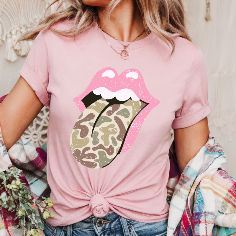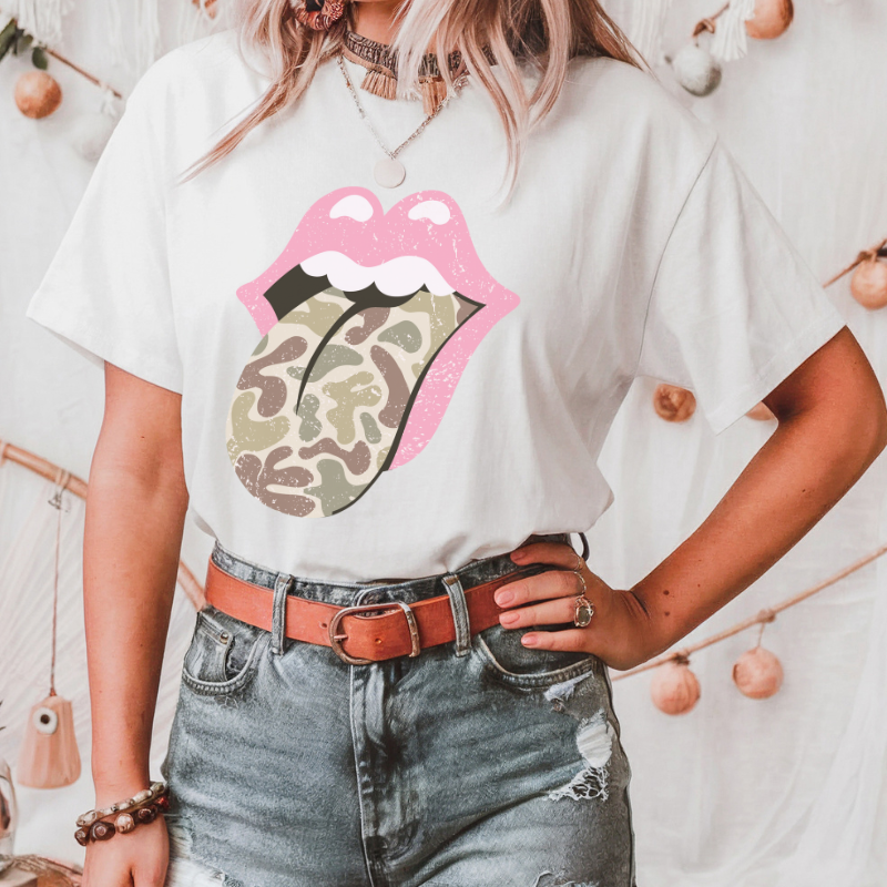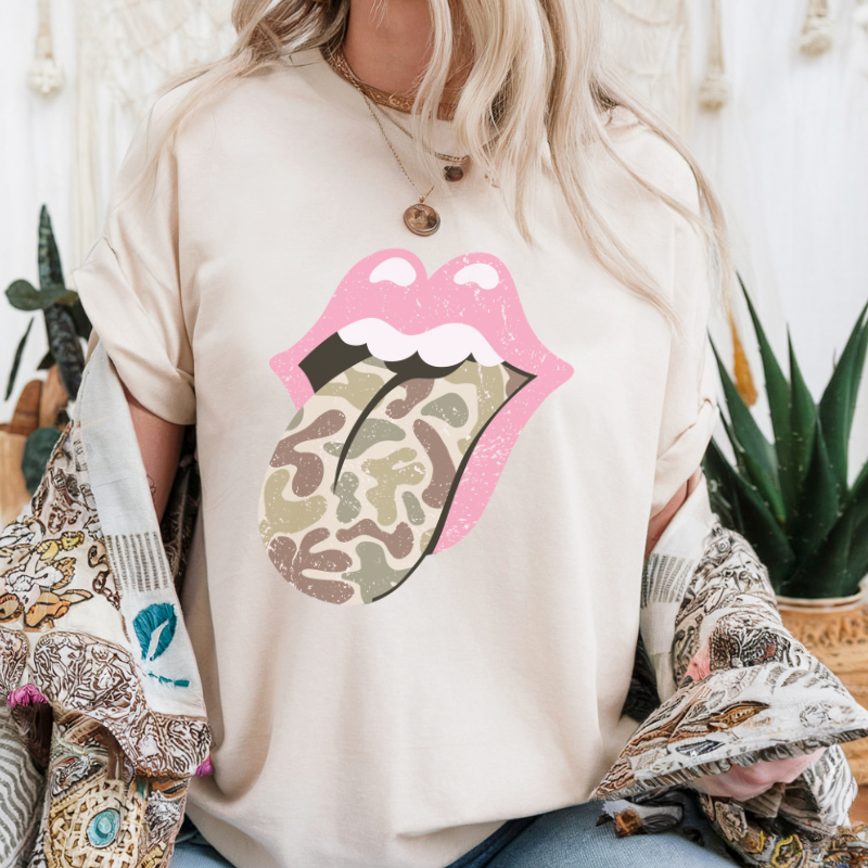 Turn heads with our edgy twist on a classic graphic—the Iconic Mouth with Camo Tongue tee! This bold design brings attitude and style together, featuring the iconic lips and tongue with a rugged camo pattern that adds just the right touch of rebellion.